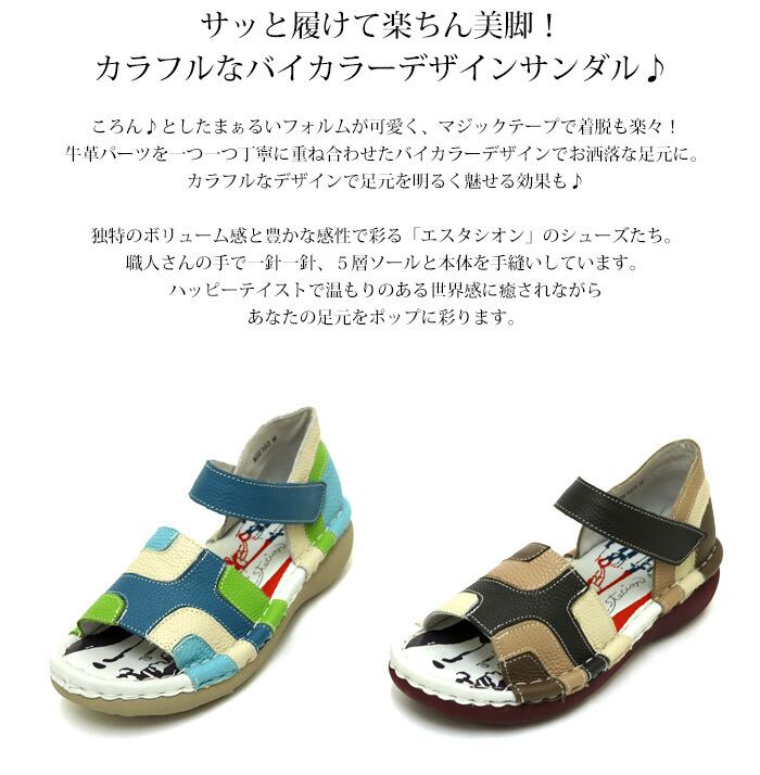 サンダル.エスタシオン.靴.レディース.estacion.ストラップ.本革.ブランド.軽量.カジュアル.疲れにくい.歩きやすい.フラット.バイカラー.モチーフ.レザー.厚底.ローヒール.新作.SS.S.M.L.LL.22.0cm.22.5cm.23.0cm.23.5cm.24.0cm.24.5cm.25.0cm