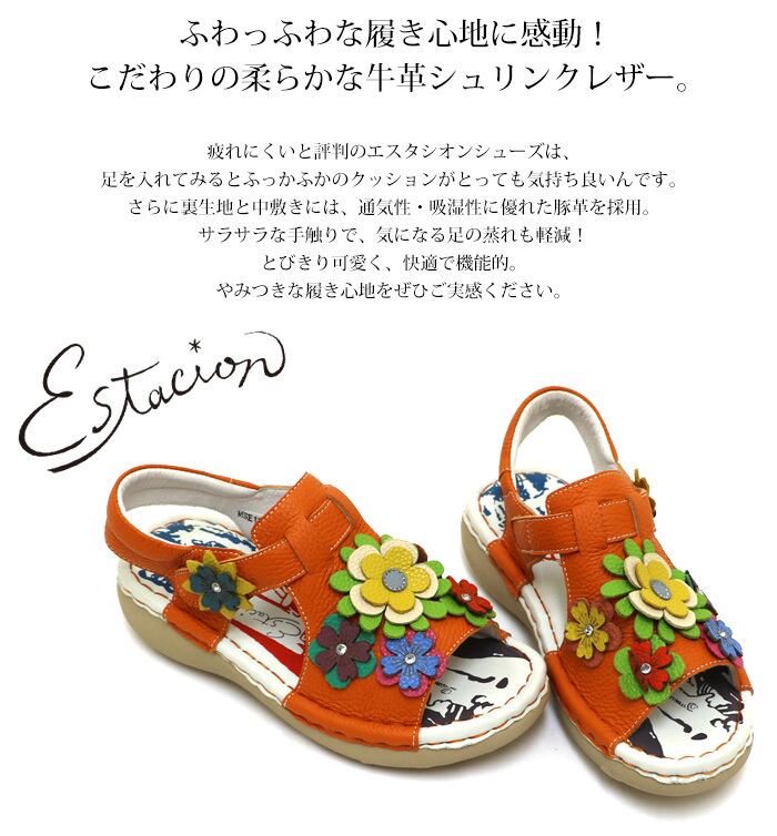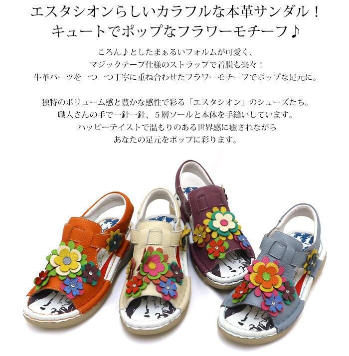 サンダル.エスタシオン.靴.レディース.estacion.ストラップ.本革.ブランド.軽量.カジュアル.疲れにくい.歩きやすい.フラット.レザー.カラフル.フラワー.花.ローヒール.SS.S.M.L.LL.22.0cm.22.5cm.23.0cm.23.5cm.24.0cm.24.5cm.25.0cm