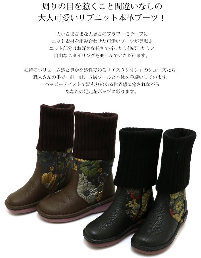 MS04【レディース】Estacion~エスタシオン~・フラワーモチーフ本革リブ2wayブーツ