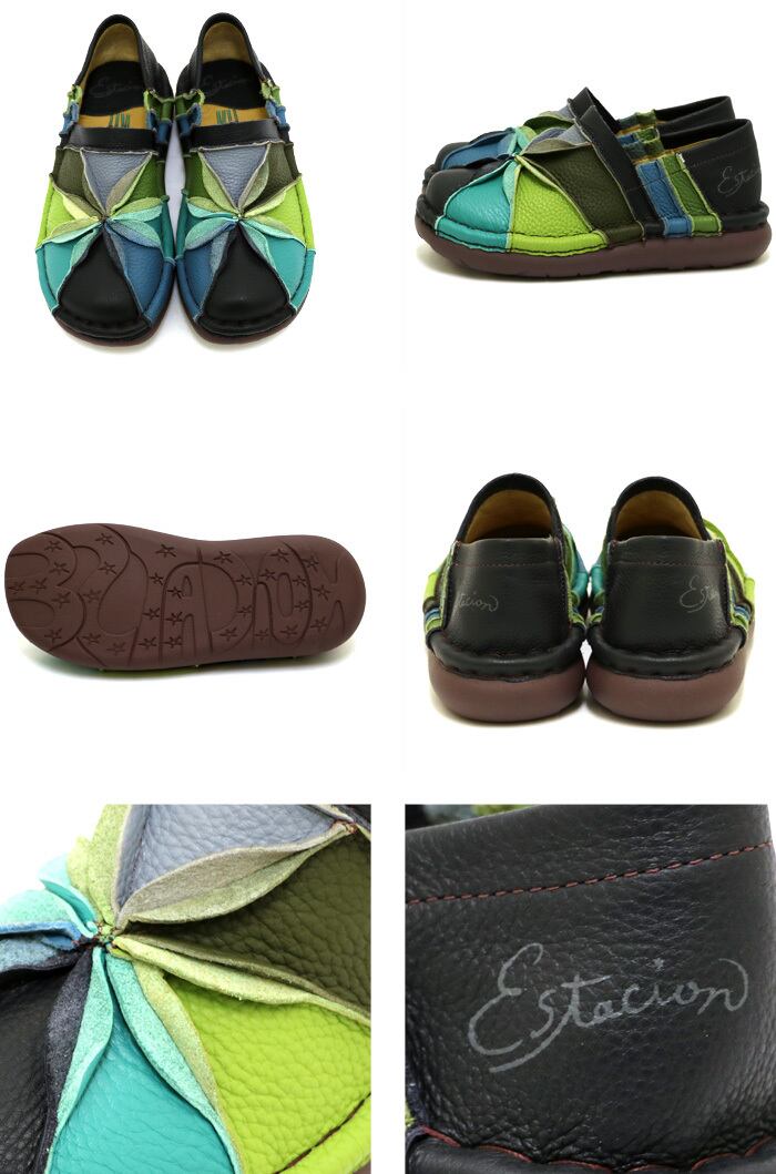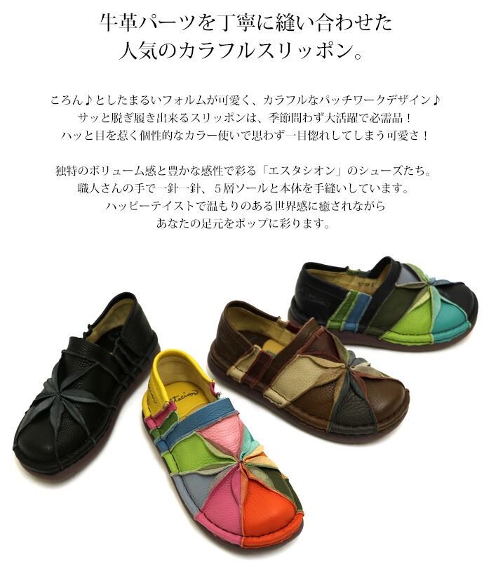 スリッポン.靴.レディース.エスタシオン.スニーカー.本革.レザー.estacion.ブランド.パッチワーク.フラワー.花.マルチ.カラフル.フラット.カジュアル.軽量.歩きやすい.新作.SS.S.M.L.22.0cm.22.5cm.23.0cm.23.5cm.24.0cm.24.5cm