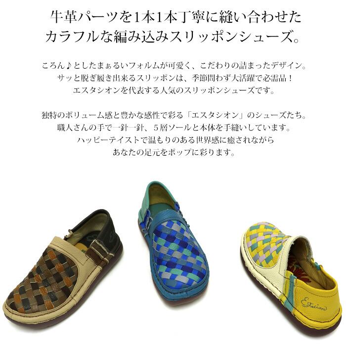 スリッポン.靴.レディース.エスタシオン.スニーカー.本革.レザー.estacion.ブランド.編み込み.チェック.マルチ.カラフル.フラット.カジュアル.軽量.歩きやすい.新作.SS.S.M.L.LL.22.0cm.22.5cm.23.0cm.23.5cm.24.0cm.24.5cm.25.0cm