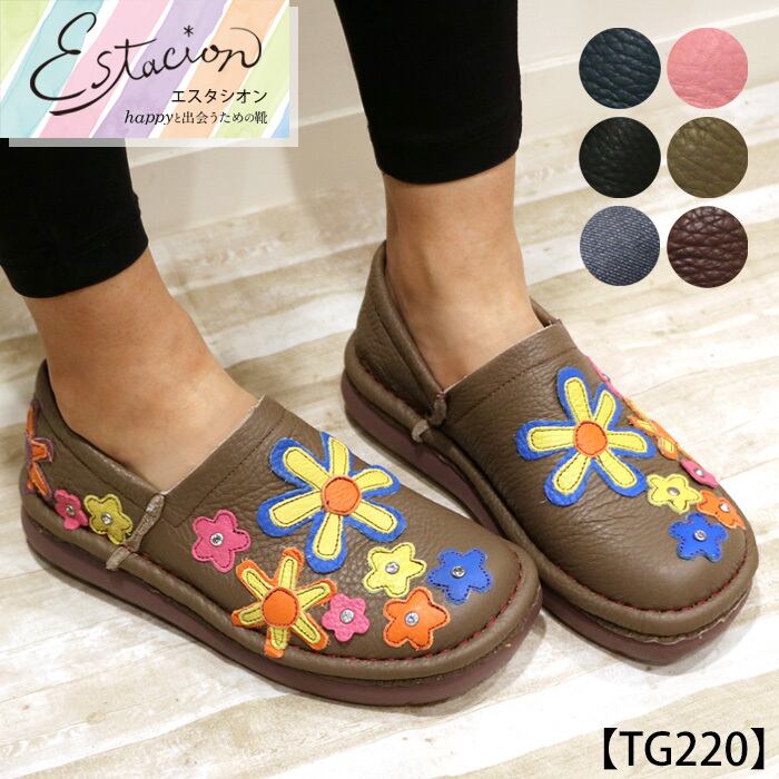 スリッポン.靴.レディース.エスタシオン.スニーカー.本革.レザー.estacion.ブランド.フラワー.花.ストーン.キラキラ.カラフル.フラット.カジュアル.軽量.歩きやすい.柔らかい.SS.S.M.L.22.0cm.22.5cm.23.0cm.23.5cm.24.0cm.24.5cm