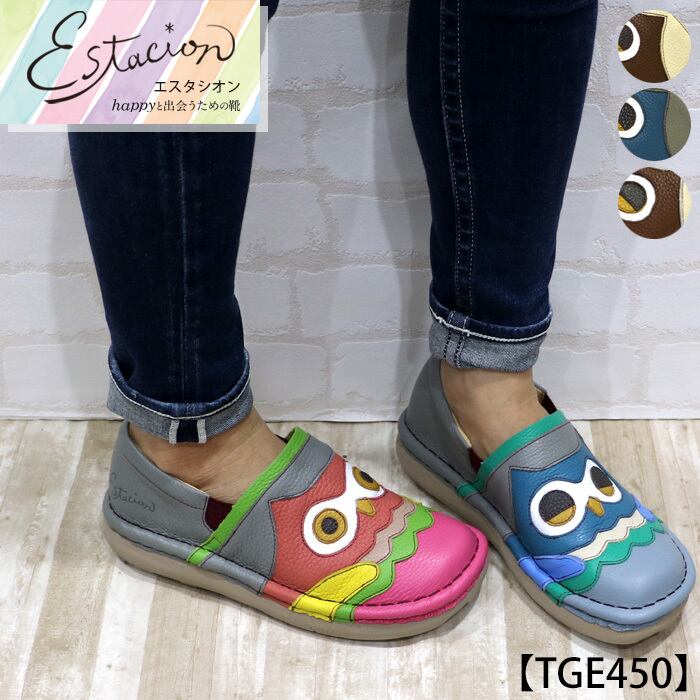 TGE450【レディース/受注生産可】Estacion~エスタシオン~・ふくろうモチーフ本革スリッポンシューズ