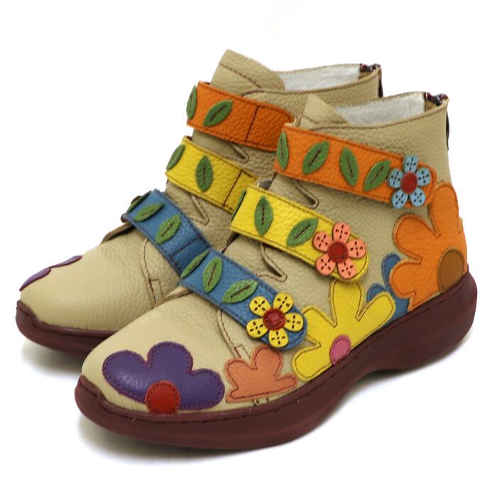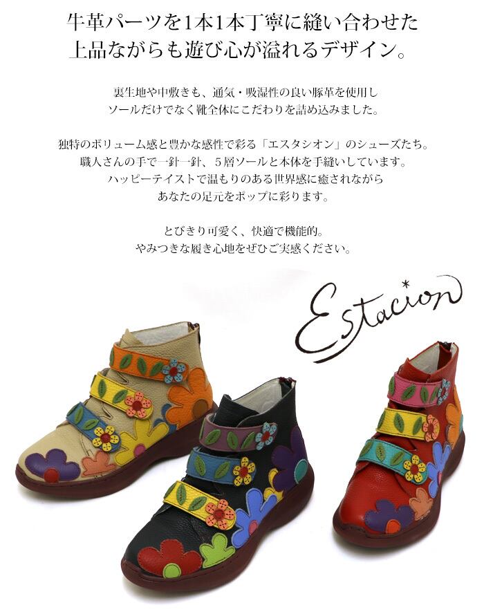 ブーツ.ショートブーツ.エスタシオン.靴.レディース.estacion.本革.ブランド.厚底.フラット.新作.疲れない.柔らかい.レザー.空気循環.ソール.カジュアル.ローヒール.花.フラワー.SS.S.M.L.LL.22.0cm.22.5cm.23.0cm.23.5cm.24.0cm.24.5cm.25.0cm
