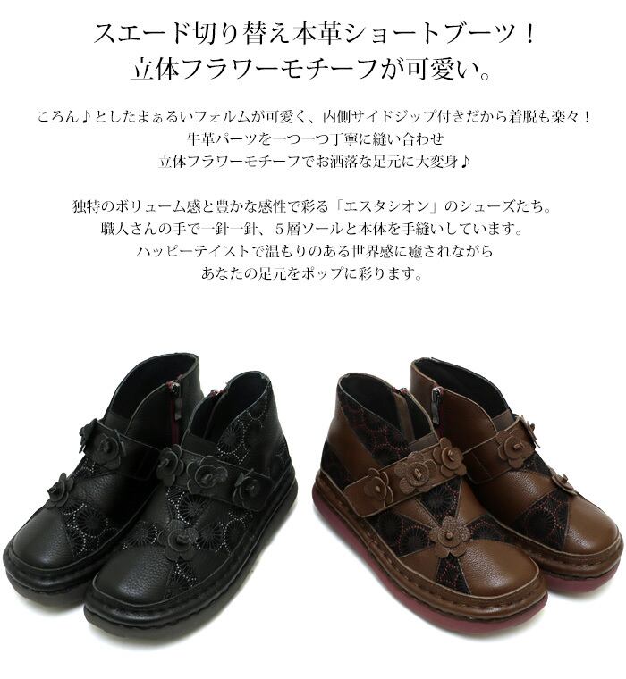 TGE550【レディース】Estacion~エスタシオン~・柄コンビフラワーモチーフ本革ショートブーツ
