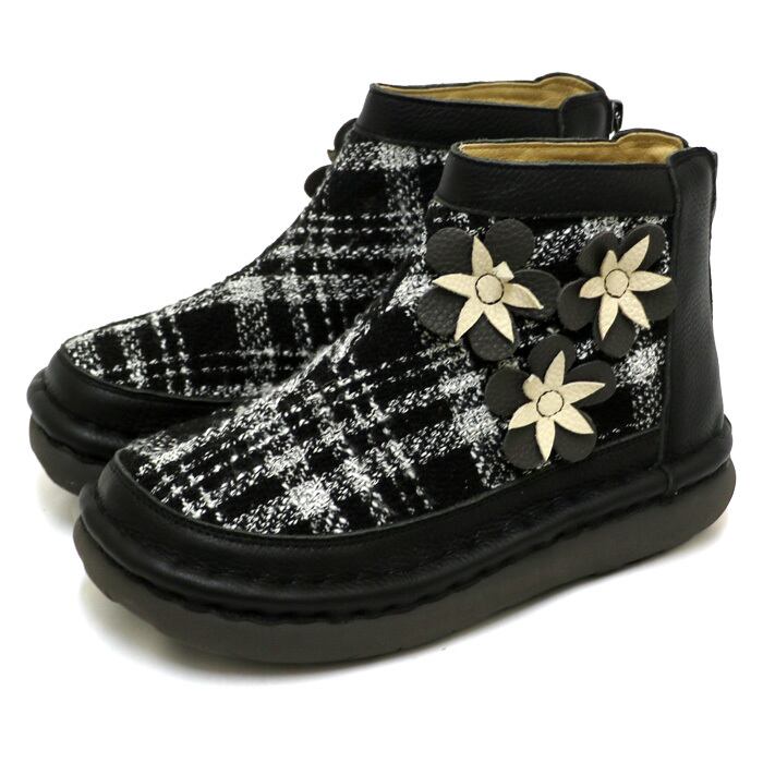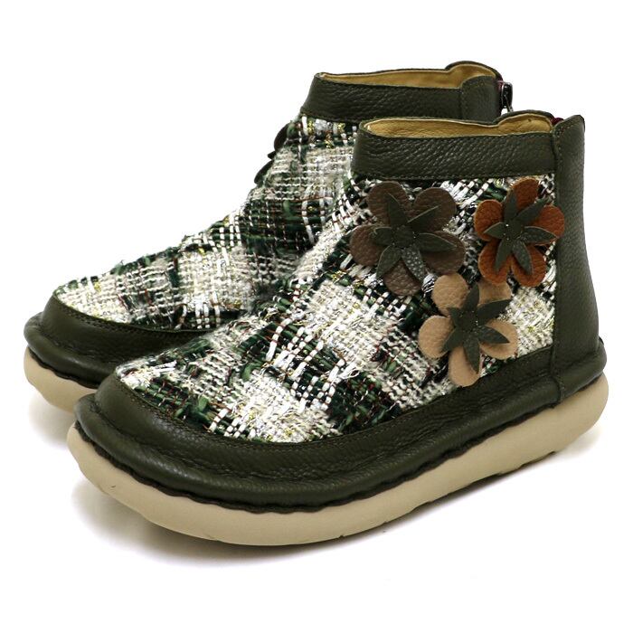 TGE552【レディース】Estacion~エスタシオン~・ツイードmix花モチーフ本革ショートブーツ