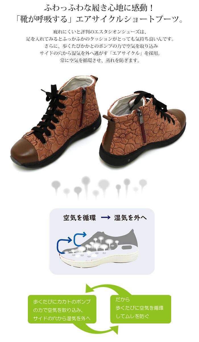 Y885AP【レディース】Estacion~エスタシオン~・花柄型押しエアサイクル本革ショートブーツ