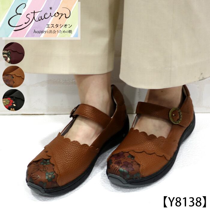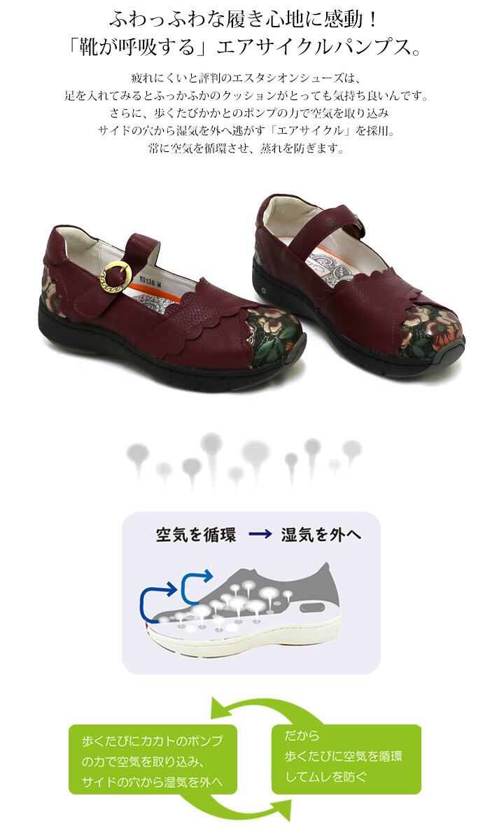 Y8138【レディース】Estacion~エスタシオン~・フラワープリントエアサイクル本革ストラップパンプス