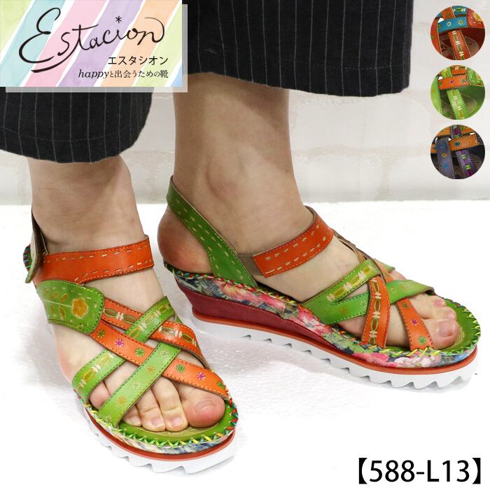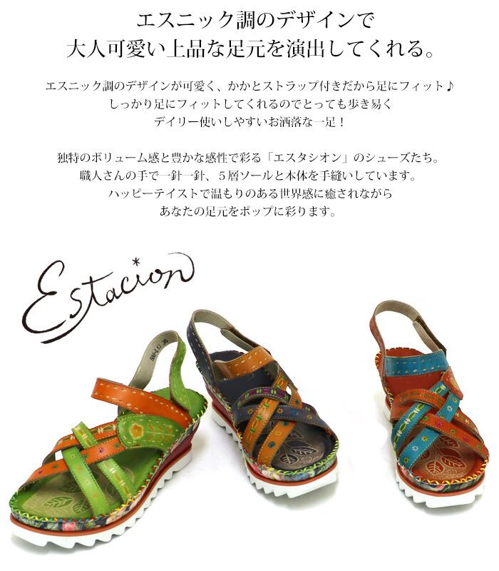 サンダル.ミュール.エスタシオン.靴.レディース.estacion.本革.ブランド.軽量.歩きやすい.フラワー.お花.エスニック調.レザー.厚底.ローヒール.新作.S.M.L.LL.22.5cm.23.0cm.23.5cm.24.0cm.24.5cm